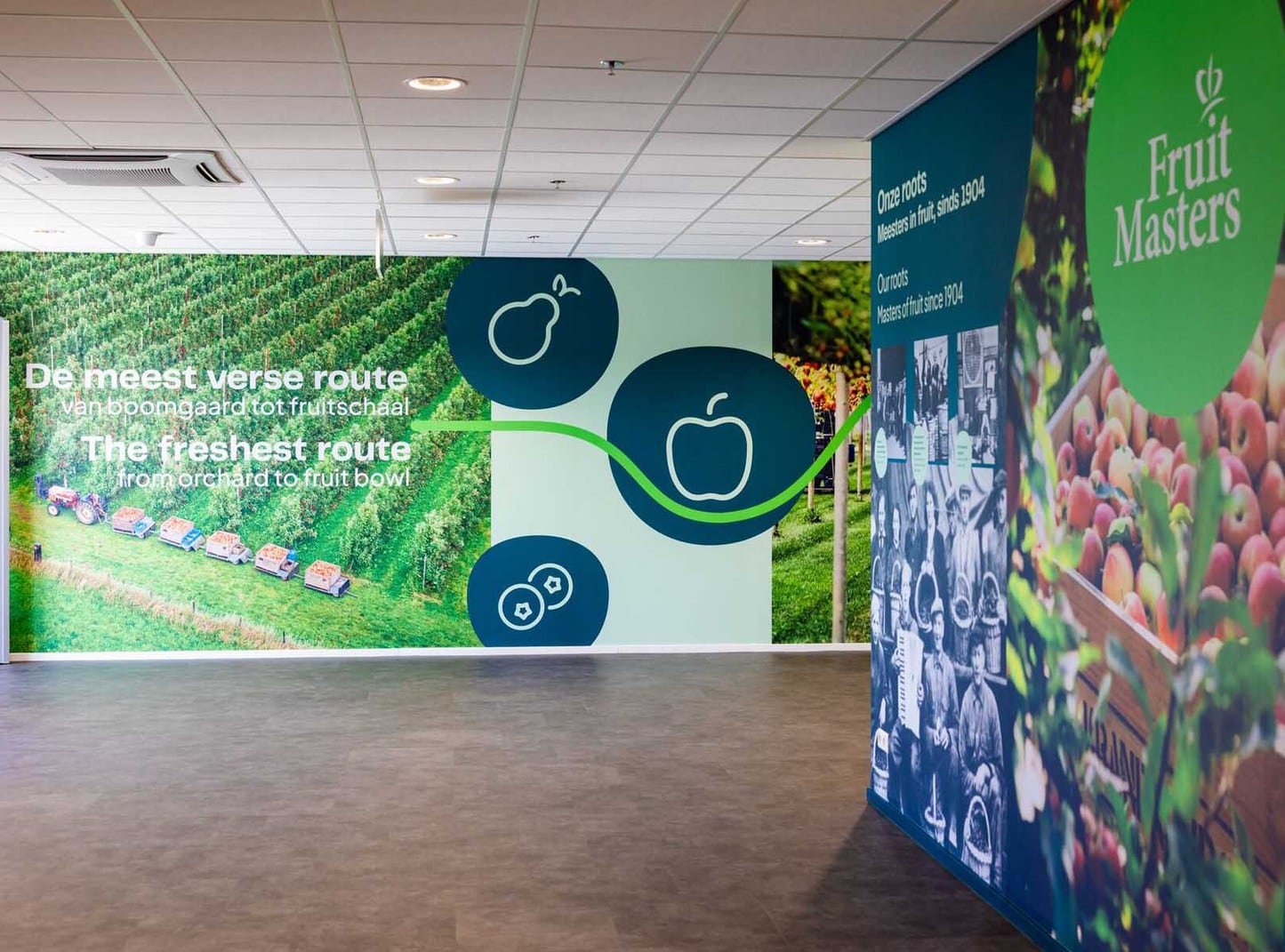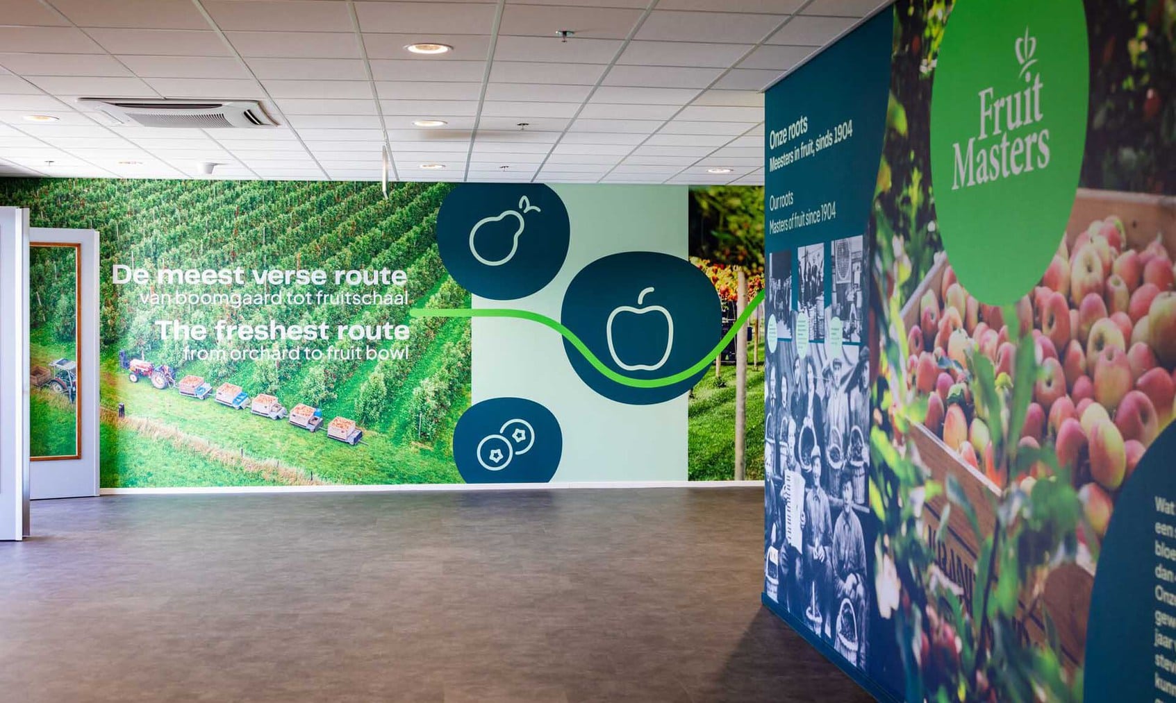 We gaven de vernieuwde huisstijl van Fruitmasters een prominente plek, van gevel tot kantoorwand, zodat elke bezoeker, medewerker en klant de merkidentiteit direct ervaart.